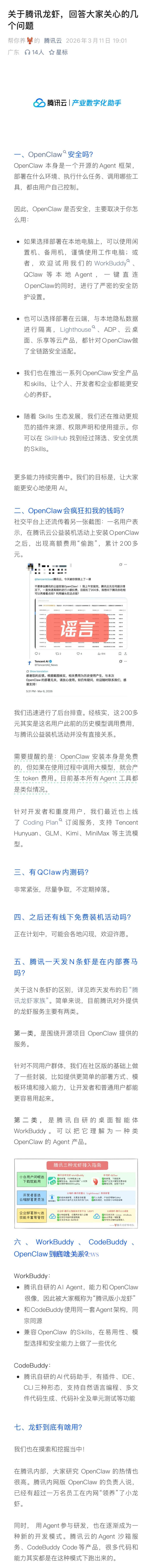 3月11日,腾讯云腾讯云针对旗下OpenClaw(龙虾)系列产品,集中回应了用户关心的安全、收费、内测码、线下活动、产品布局等问题。